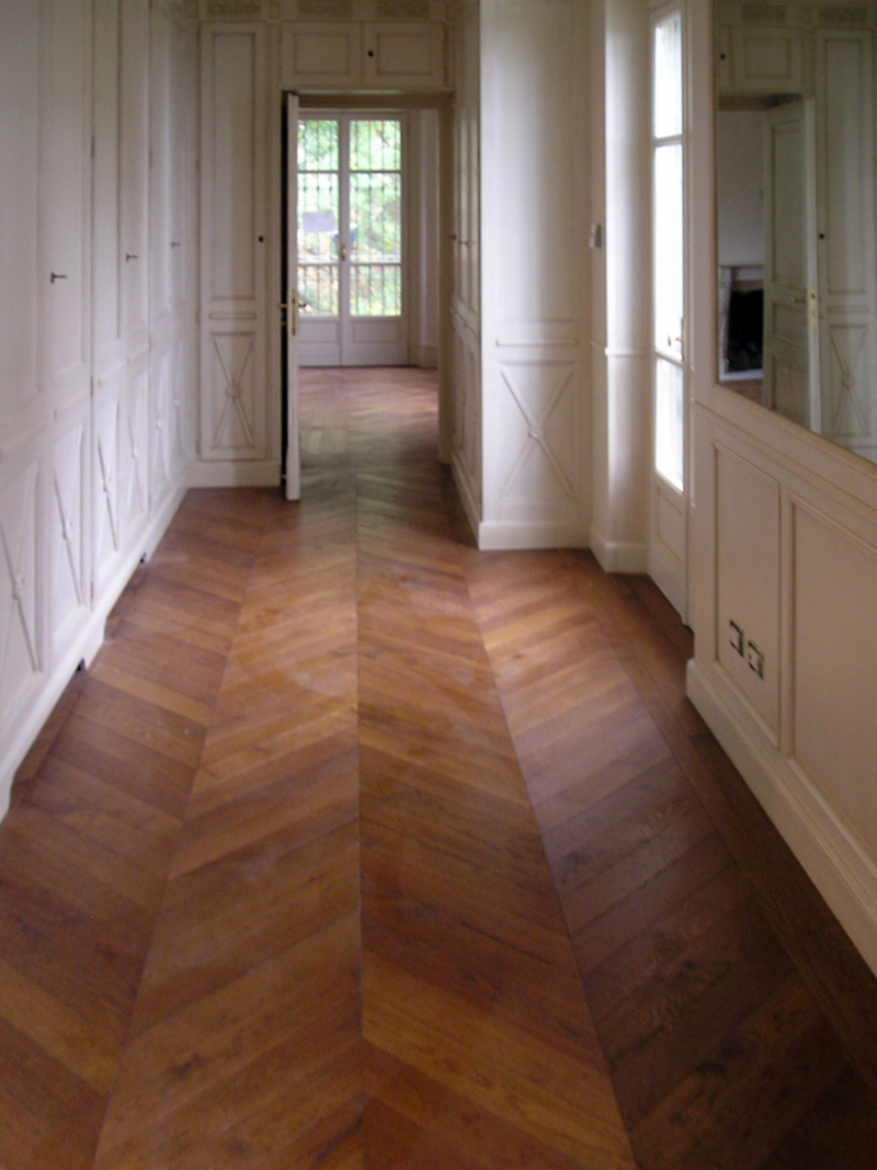boiserie e pavimento in rovere montato a “spina di pesce”