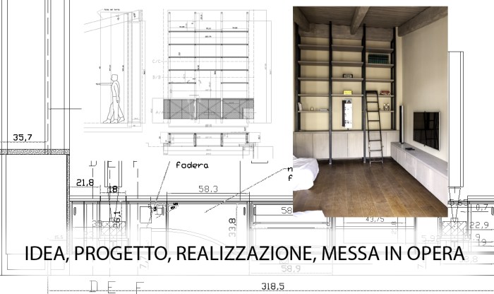 Questo progetto richiedeva la realizzazione di una cassettiera nel vano sopra i locali servizi più scaffali vari, ma sopratutto di una scala comoda, sicura , e meno visibile possibile. La soluzione è stata quella di una “quinta” dietro la testiera del letto e l’inserimento di una scala con gradini a pedata alternata che consente di ridurre lo spazio al minimo anche se obbliga ad usare sempre lo stesso passo sia nella salita che nella discesa. Un piccolo compromesso per la massima ottimizzazione. Il piano calpestio sopra l’armadio poggia su una struttura in metallo nascosta all’interno di quest’ultimo.