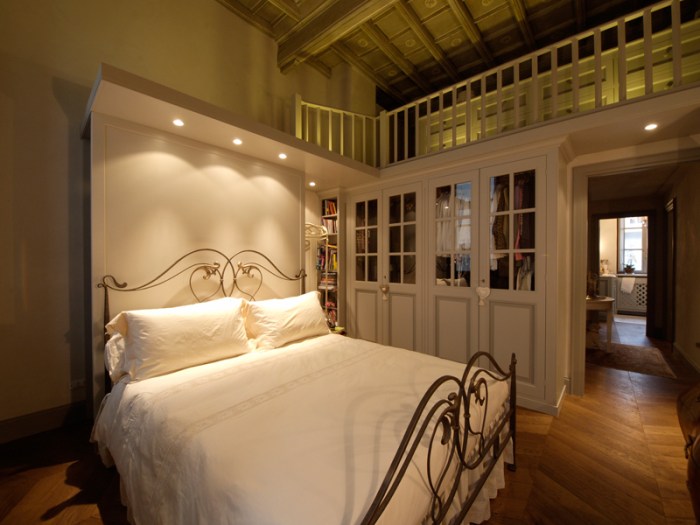 Dietro la testiera del letto il vano scala. Behind the headboard of the bed the stairwell.